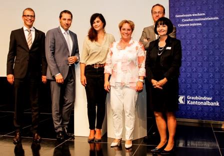 Haben gemeinsam den «Womenomics»-Anlass 2015 bestritten: v.l. Daniel Fust, Mitglied der GKB Geschäftsleitung, Moderator Urs Wiedmer, die Referenten Tonia Maria Zindel, Magdalena Martullo-Blocher und Univ.-Prof. Markus Hengstschläger.