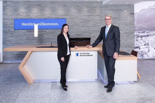 Mit ihrem neuen Filialkonzept reagiert die GKB auf die veränderten Kundenbedürfnisse: Markus Kohler, Leiter Region Thusis, und Carmen Del Pino, Teamleiterin Private Kunden.