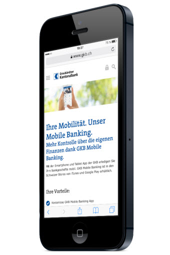 Mobiles Internet ist zentraler Bestandteil im Alltag. Immer mehr Menschen nutzen ihr Smartphone oder Tablet, um einfach und bequem Informationen aus dem Web abzurufen oder Bankgeschäfte zu erledigen. Der neue Internetauftritt der Graubündner Kantonalbank mit seiner reaktionsfähigen Benutzeroberfläche optimiert sämtliche Inhalte und sorgt für eine ideale Darstellung auf allen Ausgabegeräten.