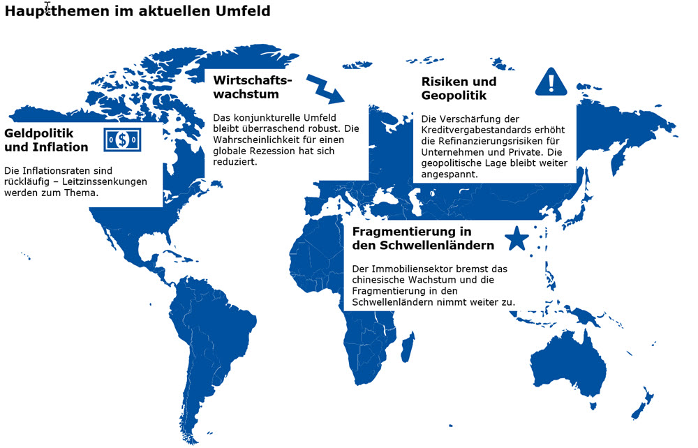 Das globale makroökonomische Umfeld hat sich zum Jahresstart 2024 aufgehellt. Frühindikatoren für die Weltwirtschaft sind auf den höchsten Stand seit zwei Jahren angestiegen. Im Industriesektor zeichnet sich ein Ende der Durststrecke ab. Die Stimmung bei den Unternehmen hat sich zuletzt wieder aufgehellt. Der Hauptgrund dafür ist die rückläufige Inflation sowie die damit verbundene Aussicht auf sinkende Zinsen in naher Zukunft. Die aktuellen Konjunkturdaten signalisieren zwar immer noch ein unterdurchschnittliches Wachstum. Die wirtschaftliche Delle ist bis jetzt aber überschaubar und die Arbeitslosigkeit verharrt auf einem tiefen Niveau. Die grossen Notenbanken werden trotz den verbesserten Konjunkturaussichten in der ersten Jahreshälfte die Leitzinsen senken.