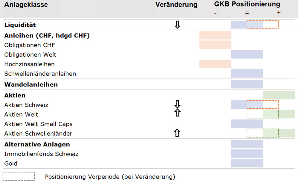 Wir bleiben bei Obligationen untergewichtet. Das Übergewicht der Aktienquote wird beibehalten. Aktien Schweiz wurden im August zu Gunsten von Aktien Welt reduziert. Ende September wurde die Quote an Schwellenländer leicht erhöht. Schweizer Immobilien und Gold bleiben neutral gewichtet.​​