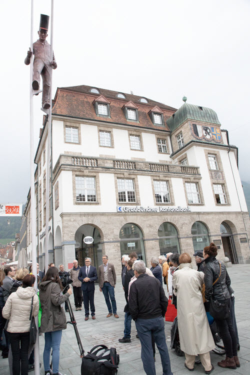 La scultura di Robert Indermaur regalerà un nuovo volto alla Postplatz di Coira. L’imponente statua è stata consegnata al pubblico, alla presenza dei rappresentanti del consiglio cittadino di Coira, della BCG e dello stesso artista. «Da circa cinquant’anni sosteniamo l’espressione creativa nel Cantone nel quadro del nostro impegno», afferma Alois Vinzens, CEO della Banca Cantonale Grigione. È particolarmente orgoglioso di avere un’opera di questo calibro di fronte alla sede principale della Banca.