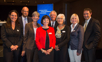 Referierten und diskutierten am "Womenomics"-Event: v.l. Aurelia Kogler (HTW), Thomas Roth und Christiana Buchli (GKB), Clivia Koch (Wirtschaftsfrauen Schweiz), Gerhard Rübling (Trumpf), Rosmarie Zapfl (Alliance F) und Ariane Ehrat (Engadin St. Moritz) zusammen mit Moderator Urs Wiedmer (druckfähige Bilder im Anhang).