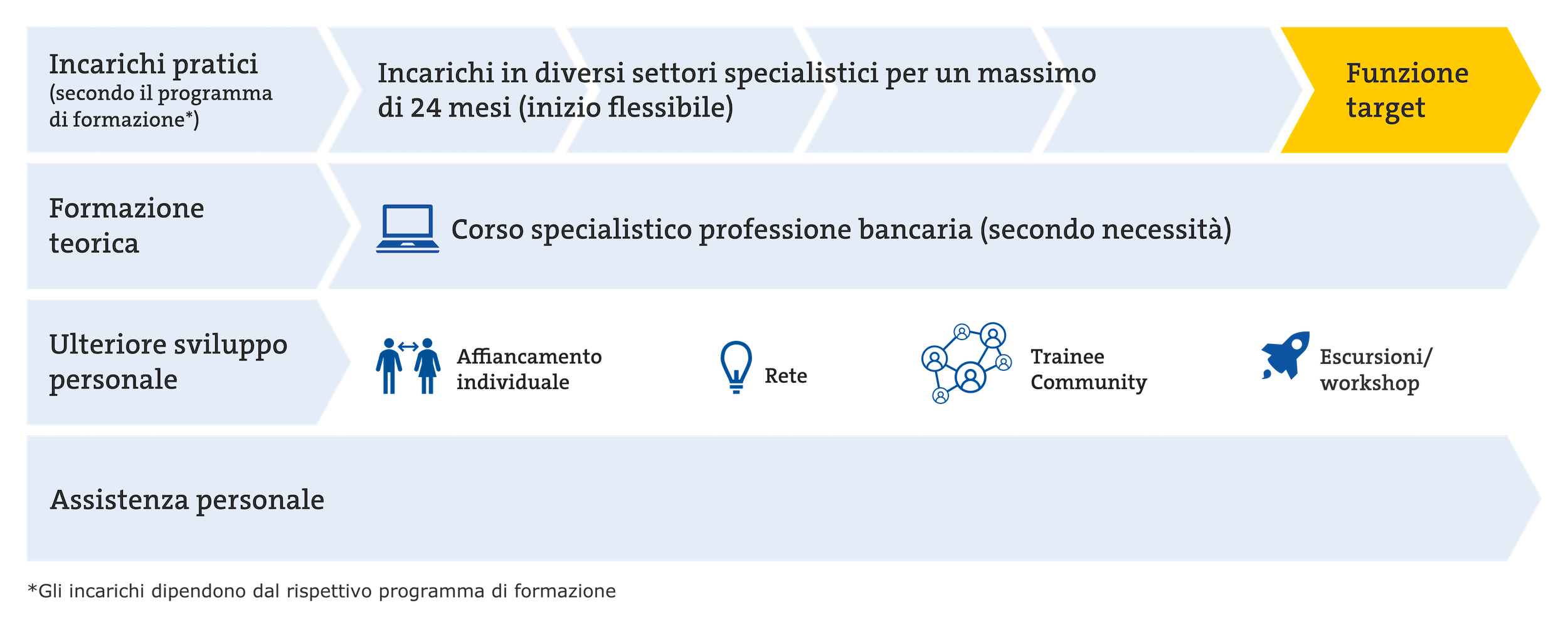 Hai concluso con successo il tuo bachelor o master e ora hai voglia di iniziare la tua carriera nel settore bancario? Il nostro programma talenti ti offre una formazione «on the job» personalizzata, che puoi completare entro un massimo di 24 mesi. Scegli tu il programma di formazione che preferisci e noi ti prepareremo in modo mirato per la tua posizione futura.